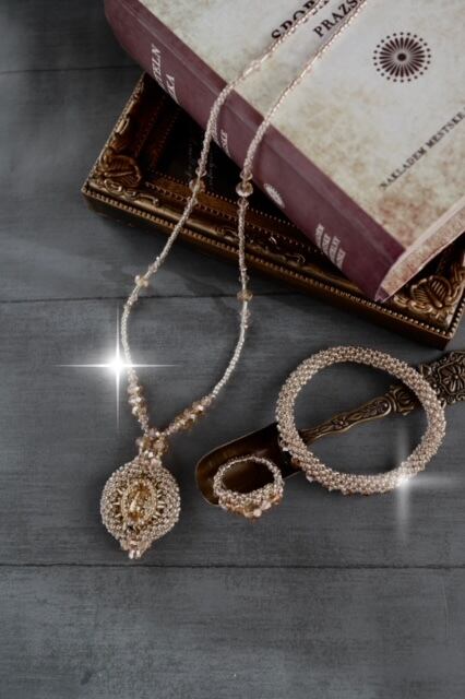 バングルとリングはクリスタルを編みこんで細身ながら繊細で上品な仕上がりにしています。