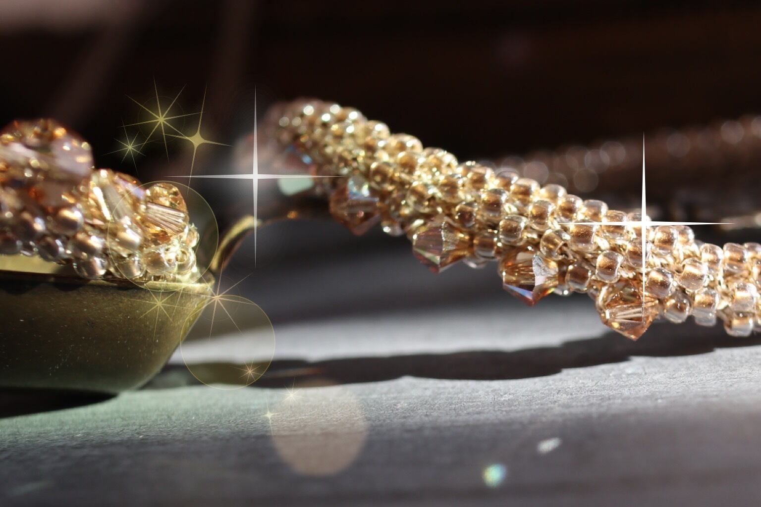 チューブクロッシェに竹ビーズを編みこみ、表裏の竹ビーズでクリスタルカボションをフレーミングしています。